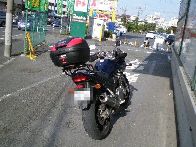 | リアキャリアは、RIDING SPOT製 BANDIT1200用。 このリアキャリア、スチール製で作りが単純だし、グラブバーの取り付けボルト4カ所でしか止まっていませんが 強度を確かめようとキャリアを下から上に持ち上げようとすると、 ゆがんだり曲がったりすること無く車体が浮き上がるほど強度が有ります! 左右に振り回してもゆがむことなく全くビクともしない優れものです。 トップケースは定番のGIVI 品番はE370。 キャリアの中央のバー部2本の1本ずつに、それぞれ6mmの穴を2カ所 計4カ所のトップケースネジ止め用の穴開け加工をして GIVIのベースプレートを完全にネジ止めし、トップケースを固定しています。 この状態で結構な速度で走って全く問題なし、タンデムで大人が寄っかかって乗って走っても問題なしでした。 マフラーはヨシムラのJMCA対応 チタンカーボンフルエキで元から取り付けられていました。 購入した最大の決め手はこのマフラーかも(笑) 排気音なんてハッキリ言えばどうでもよくて、やっぱ車重量が気になりますから少しでも軽くなれば。 勿論車検もガス検&音量共にこのままパスしています。 |