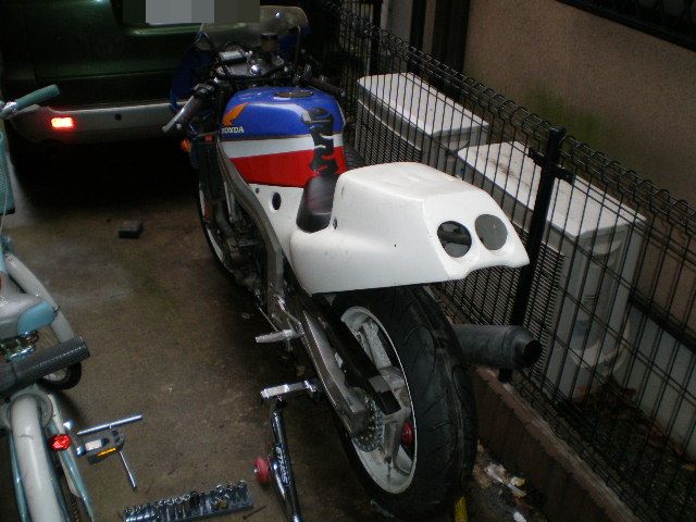 カウルはトップだけ流用し、アンダーカウルは取り払いました。後にオイル受け用アンダーカウルを手に入れ、