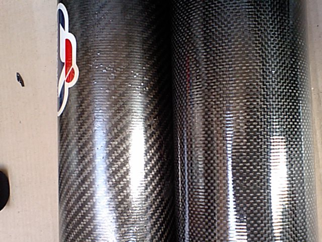 テルミの純正カーボンとトガシで買ったカーボンパイプの模様の違い。 テルミ純正は 「綾織り」 トガシの汎用品は 「平織り」 強度などの差はほとんど無いそうで、見た目の違いだそうです。 ちなみにトガシには 「綾織り」のカーボンパイプが業者さんの参考って事で展示?していました。 アルミの内張は無かったし売ってはいなかったようです。 |