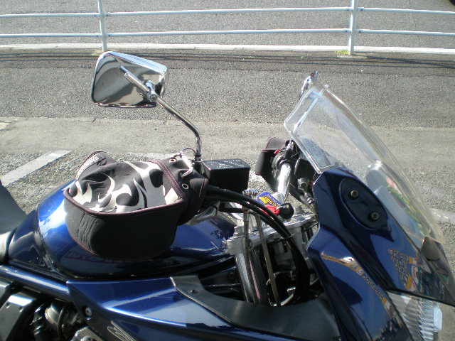 | ミラーは純正からハンドル側へ移行、ナポレオンのメッキタイプの物。 ハンドルカバーは寒いので・・・(笑) バーハンは純正の680mm(短!)から、さらに短い プロトのEFFEX イージーフィットバーCB400SF用(660mm)の物に変更しました。 ブレーキホースはGSX−R1000のアップハン仕様の時に使っていたBRAKING社製ステンメッシュホース(好きな長さでオーダー出来る) で作ったブレーキホースをそのまま流用。 |