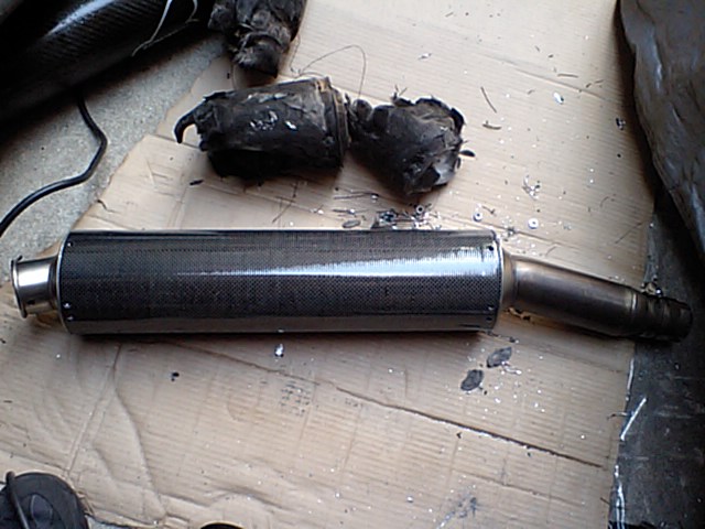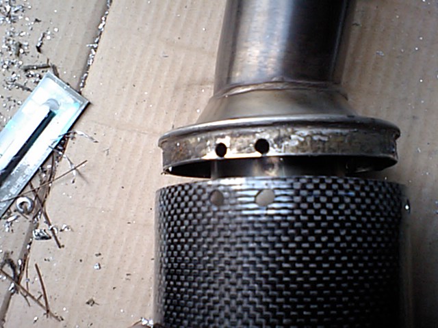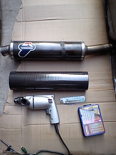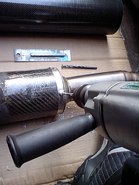 いきなり画像が飛びますが・・・ とりあえずリベットをすべて外してテルミのカーボンパイプを外したら中身の残り少ない使い切ったグラスウールを取り去り トガシで買ったカーボンパイプをエキパイ側に仮入れし、リベット止めするための穴位置を決めて カーボンパイプの方にも穴を開けていく。 少々ずれたけど液ガスでタップリ埋めるのでまぁ良いかと |