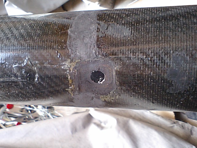 カーボンパイプを外し、内部のボルト止めの部分を切削し、カーボンパイプのステー固定用の穴2カ所をFRPやパテなどで埋めて内張にアルミの板(0.1)を貼り付けて補強。